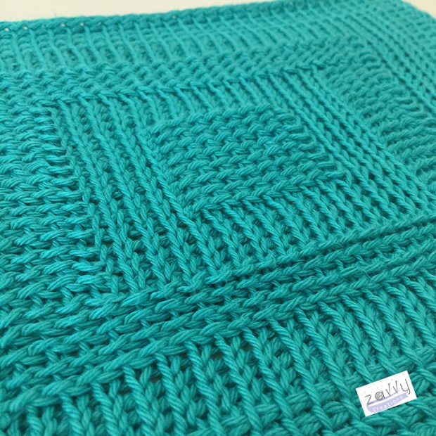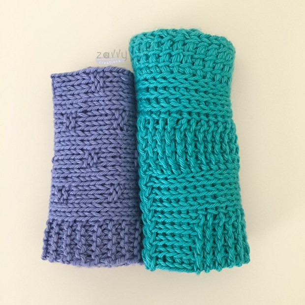 Here are the cloths, all made with Knit Picks Shine Sport. Because this a mixture of Pima cotton and bamboo, I prefer using this yarn for wash cloths (facial cloths). Dishie or another mercerized cotton yarn, is sturdier for dish cloths. The Hydrangea and Cream colors are knitted in the same pattern, a “fancy stitch combination” called sugar cubes stitch. I got the tutorial from Very Pink Knits. The bright teal colored cloth is actually done in Tunisian crochet but it has a lot of Tunisian knit stitch in it. It also makes for a gorgeous and sturdy facial cloth.