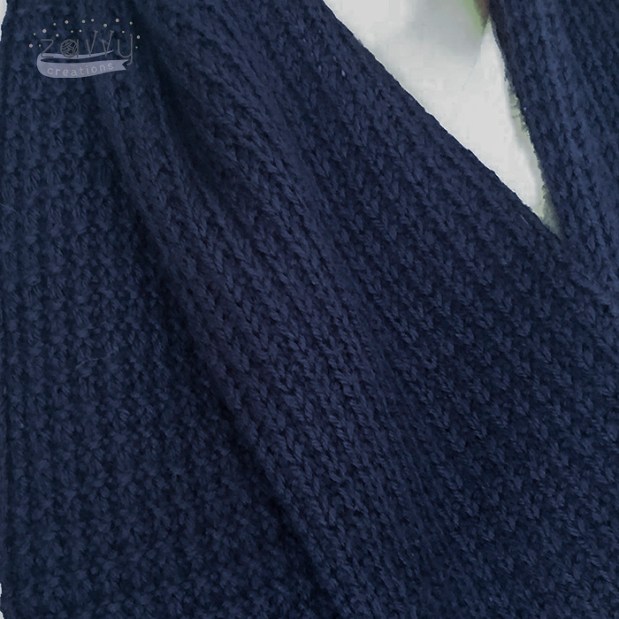 The pattern is easy peasy for beginners (knits and purls only) from B.Hooked Knitting. One side is only knit stitches and the other side switches between knit and purl stitches. It creates a gorgeous textured scarf on both sides. No matter how this scarf is wound around the neck, it will be pretty to look at.